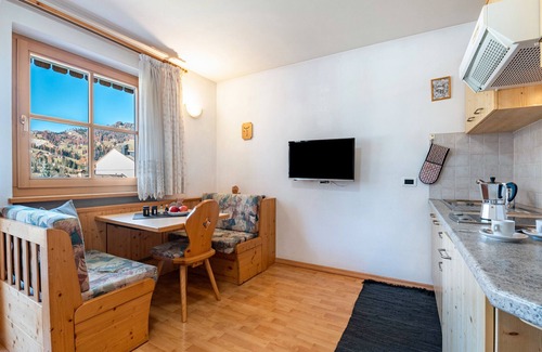 The holiday apartment 3 with step-free interior, which is situated in Badia, overlooks the Alps. The 31 m² property consists of a living room with a sofa bed for 2 people, a kitchen, 1 bedroom and 1 bathroom and can therefore accommodate 2 people. Additional amenities include high-speed Wi-Fi (suitable for video calls) as well as a TV. This vacation rental features a private balcony for your evening relaxation.