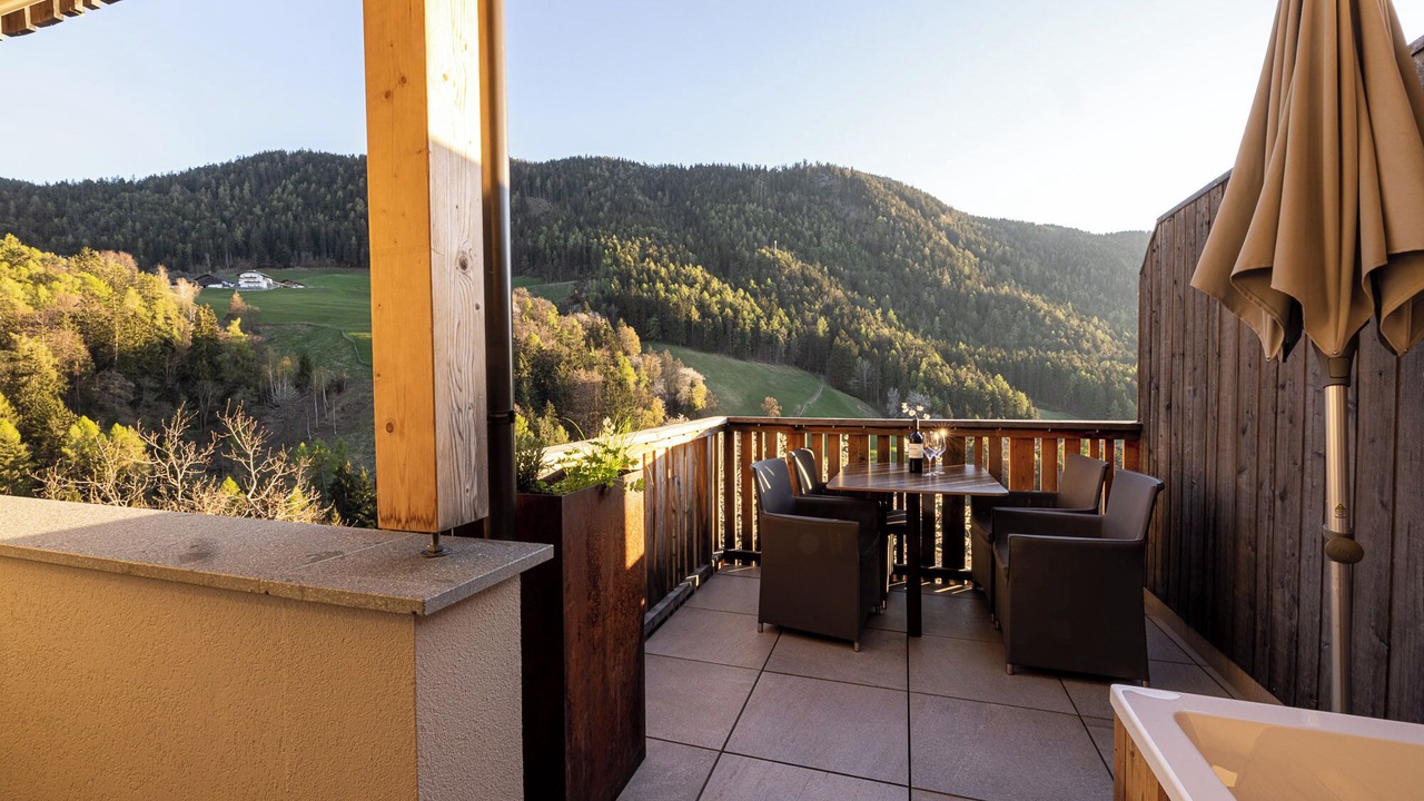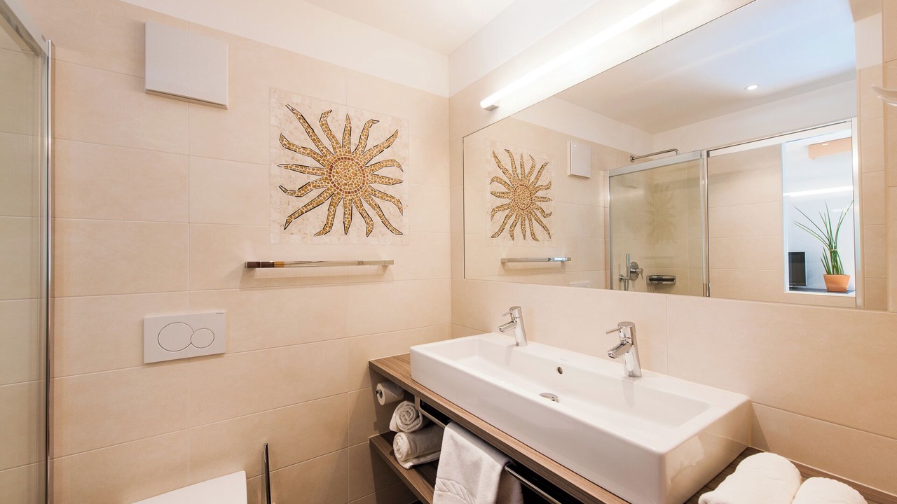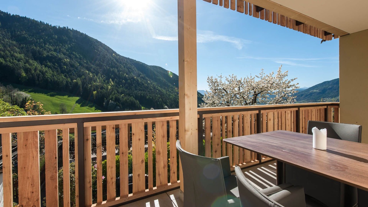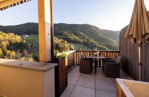 The cozy apartment “Sonnleiten Sonne Mond u Sterne” of family Mahlknecht is situated in Steinegg (Collepietra), in the beautiful area of South Tyrol, and is ideal for hiking, biking or romantic couples holidays. The family-friendly apartment consists of a living room, a well-equipped kitchen with a dishwasher, two bedrooms as well as one bathroom and can therefore accommodate 4 people. Additional amenities include Wi-Fi, a safe, satellite and cable television, a highchair and a baby cot. The second bedroom is a small separate room with a bunk bed (185x85 cm) for children, which can also be used as a stowage when no children are present. The panoramic balcony with herb garden invites you to sit and eat, and in the jacuzzi tub with a view of the Dolomites you can relax perfectly. In the communal outdoor area, you will find a spacious garden, where you can enjoy your own meals from the stone barbecue. Another highlight of the residence is the 200 m² spa area, including a 30° C indoor pool with massage nozzles, 2 saunas (one of them hot), a hay bed, a quiet room, as well as a play area for children. Here you can relax and unwind after a day of hiking, biking or skiing. The nearest supermarket is only a few minute walk (200 m) away, and restaurants with local dishes can be reached on foot from the apartment. The area is known as the first "star village", therefore you will find a planetarium, a solar observatory and a planet path 13 minutes (9.5 km) by car from the village, where you can look at the stars and get a feeling for the vastness of our solar system. Lake Carezza is located 34 minutes (25.7 km) south of the apartment. The capital of South Tyrol, Bolzano, can be reached by car in 22 minutes (13,8 km) and the famous mountain group Catinaccio is 39 minutes (29 km) east of the village.