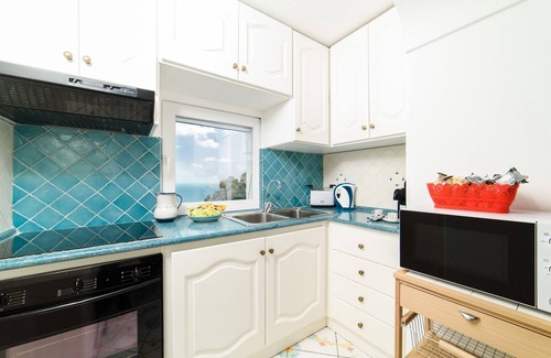 Upon entering we find a bright living area consisting of a dining room equipped with table and chairs for six people, double sofa bed, adjoining kitchen with induction hob, steel sink, toaster and kettle, microwave and electric oven, extractor hood. The living area is furnished in shades of sea green, light blue and blue, with typical Vietri ceramics.