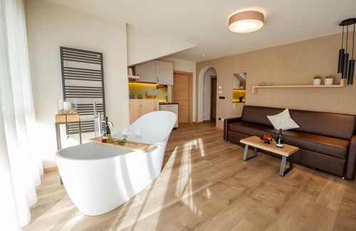 The apartment "App. Gewürztraminer" is located in the second floor of the residence "Haus Gregori" in Kaltern. The modern apartment with a premium natural wood interior and mountain view consists of a very well-equipped kitchen with a dishwasher, 2 bedrooms (one with a kingsize bed and one with a sofa bed) as well as one bathroom. It can therefore accommodate 4 people. Amenities also include Wi-Fi, air conditioning and 2 TV sets with satellite and cable TV. A baby bed (€10 per day) and a high chair (€5 per day) are available upon request at an extra charge. There is also a washing machine, a dryer and an iron in a laundry room, which can be used for free. Moreover, the apartment boasts a south-east balcony with a beautiful view of the pool and a shared garden where you can relax with a good book and leave the stress of everyday life behind you. In the communal area you will also find a pool and gym equipment. The highlight of this property is definitely the sauna and jacuzzi, which are located on the roof terrace. Here you can also relax on the comfortable furniture with a glass of wine in your hand and admire the wonderful view. Within a 5-minute walk you will reach restaurants, cafes, bakeries and supermarkets. Public transport is also located in the immediate vicinity and the centre of Bolzano is a 27-minute drive away (16.1 km).
