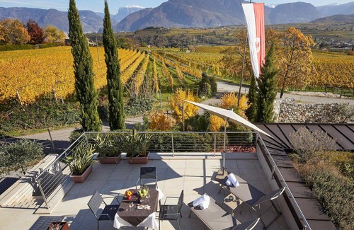 Our apartments are situated in a sunny position at 450 metres on the edge of the historic wine village of St. Pauls in South Tyrol, amidst gently rolling vineyards in a uniquely quiet location. In addition, the breathtaking natural spectacle of the South Tyrolean lowlands with an unrestricted panoramic view towards Bolzano, the Mendola Mountains and the Dolomites.