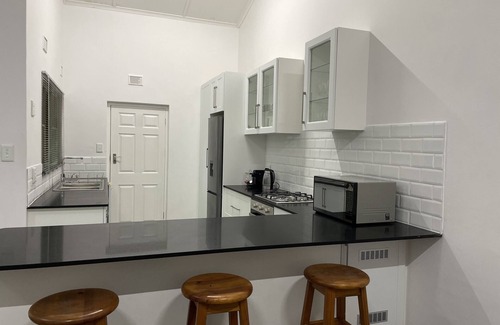 This newly renovated house is perfect for family trips. It boasts a spacious layout and is also solar equipped. It has a lovely patio with a fireplace that looks on to a beautiful garden. The house is ideally located within walking distance to shops and restaurants, as well as a short drive to the beach and the iSimangaliso Wetland Park (World Heritage Site).